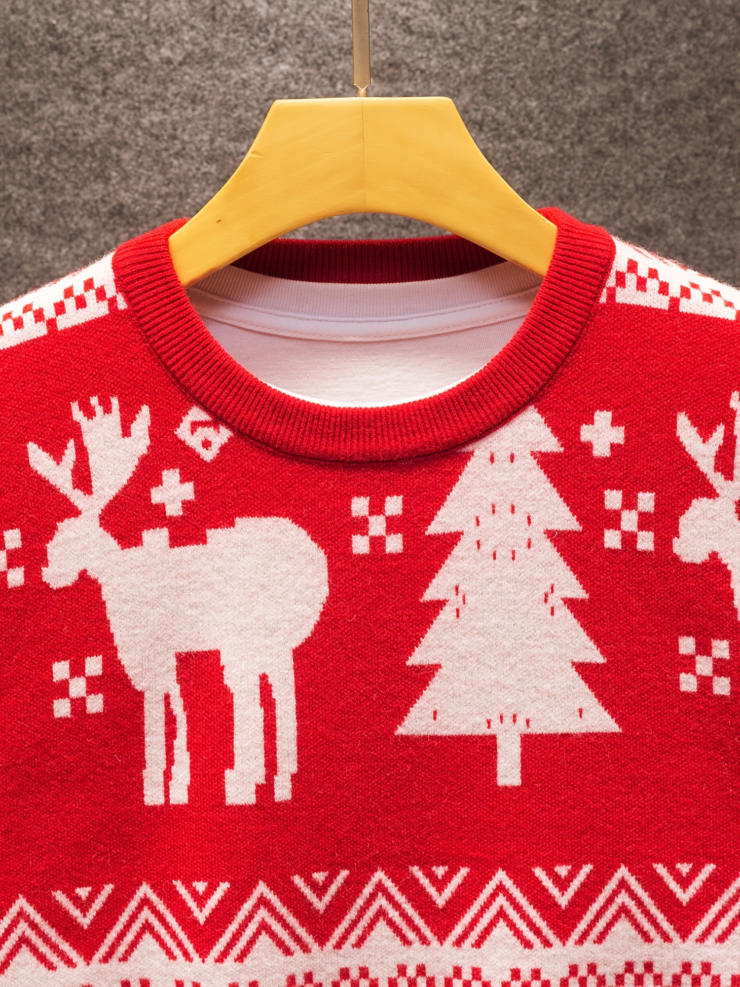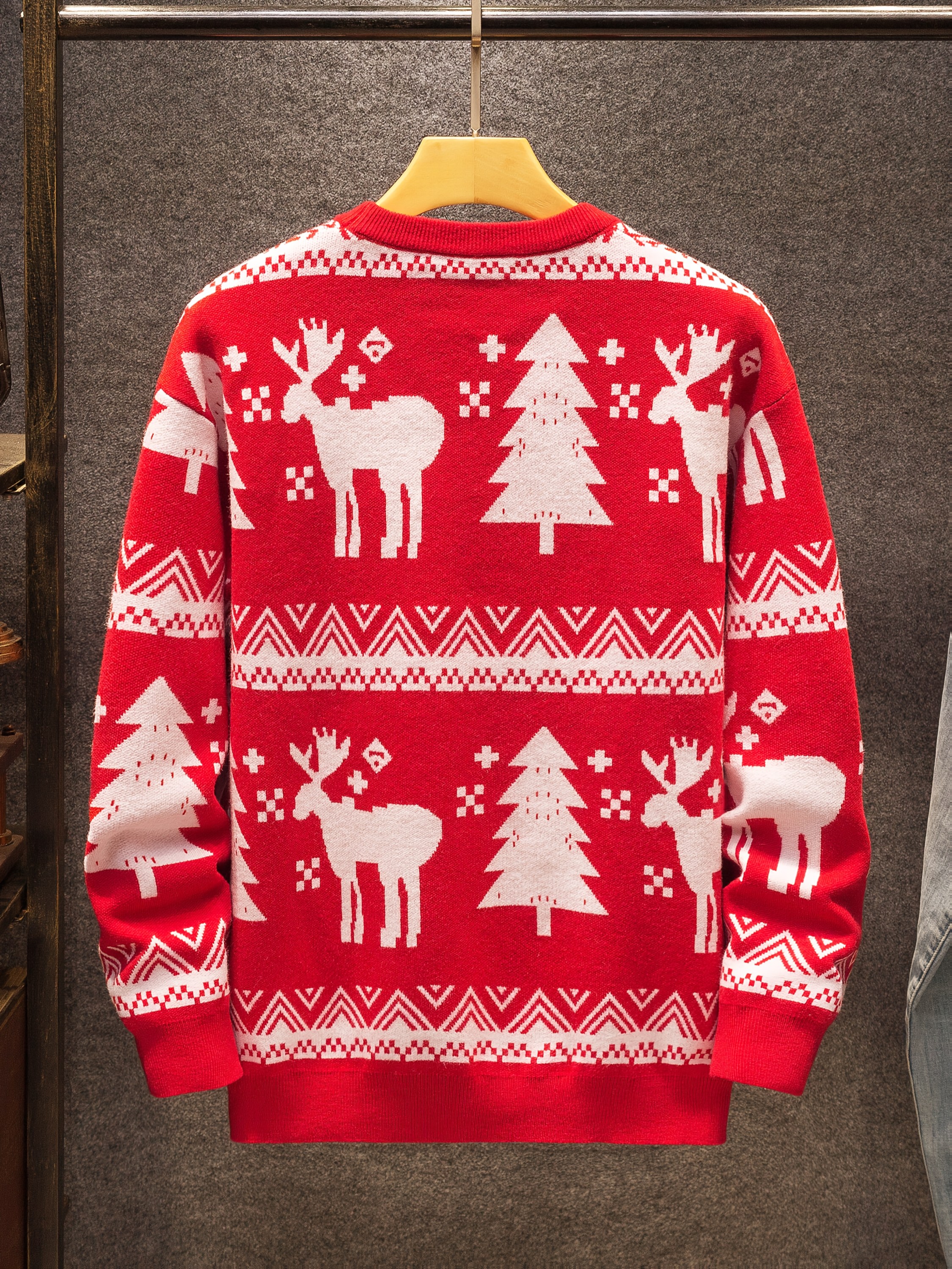 1pc Festive Acrylic Christmas Sweater for Men and Women - Crew Neck, Long Sleeve, Regular Fit, Knit Fabric with Deer and Tree Patterns, Medium Stretch, Party Pullovers for Fall/Winter