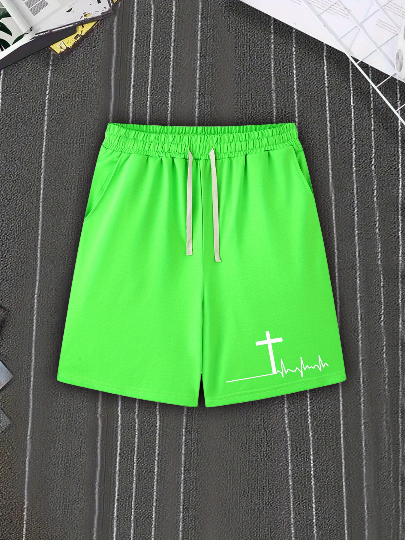 Men's Casual Cross Print Shorts with Pockets - Breathable Polyester, Machine Washable