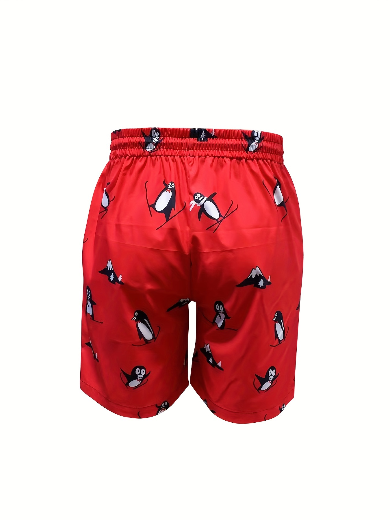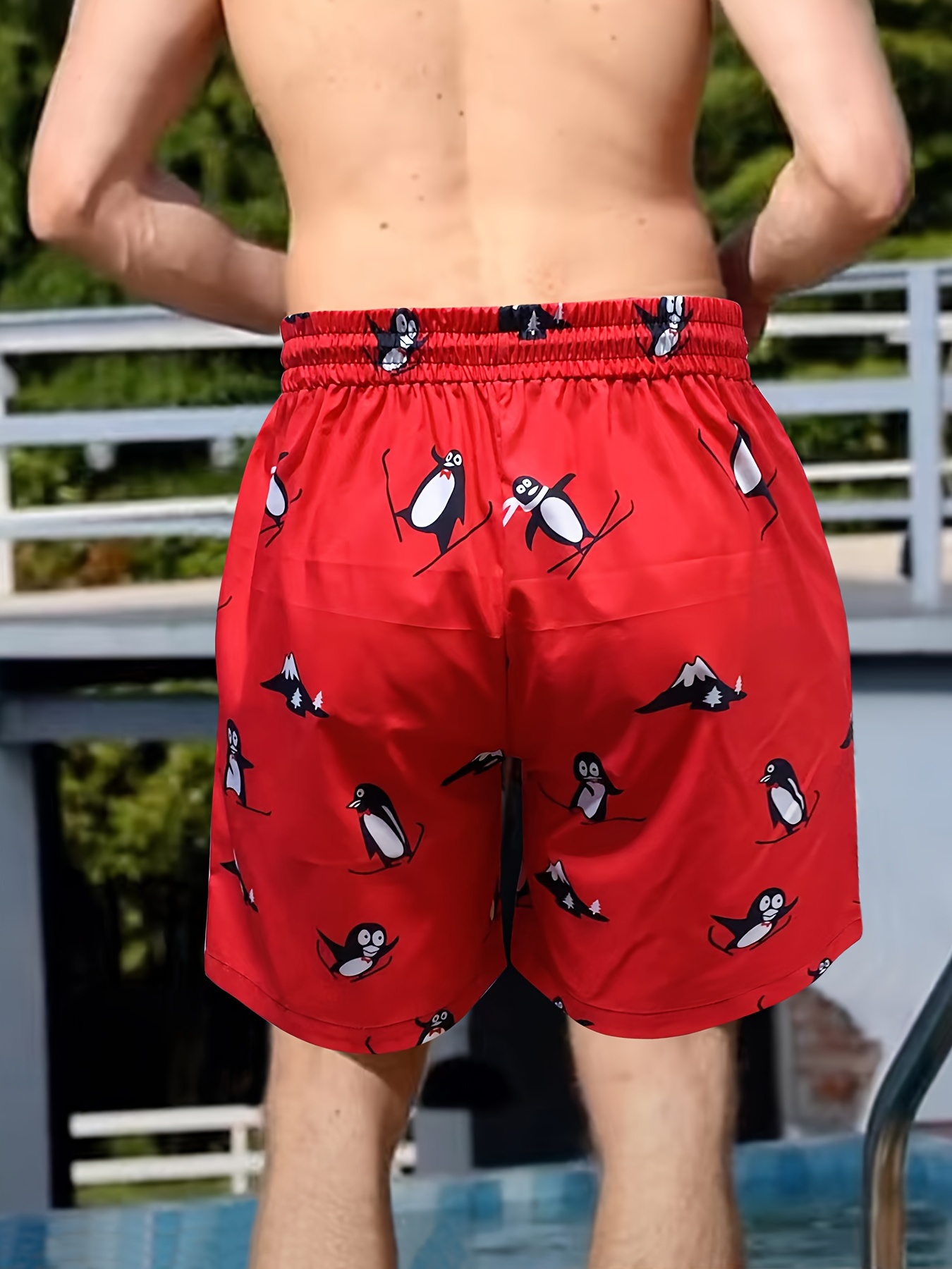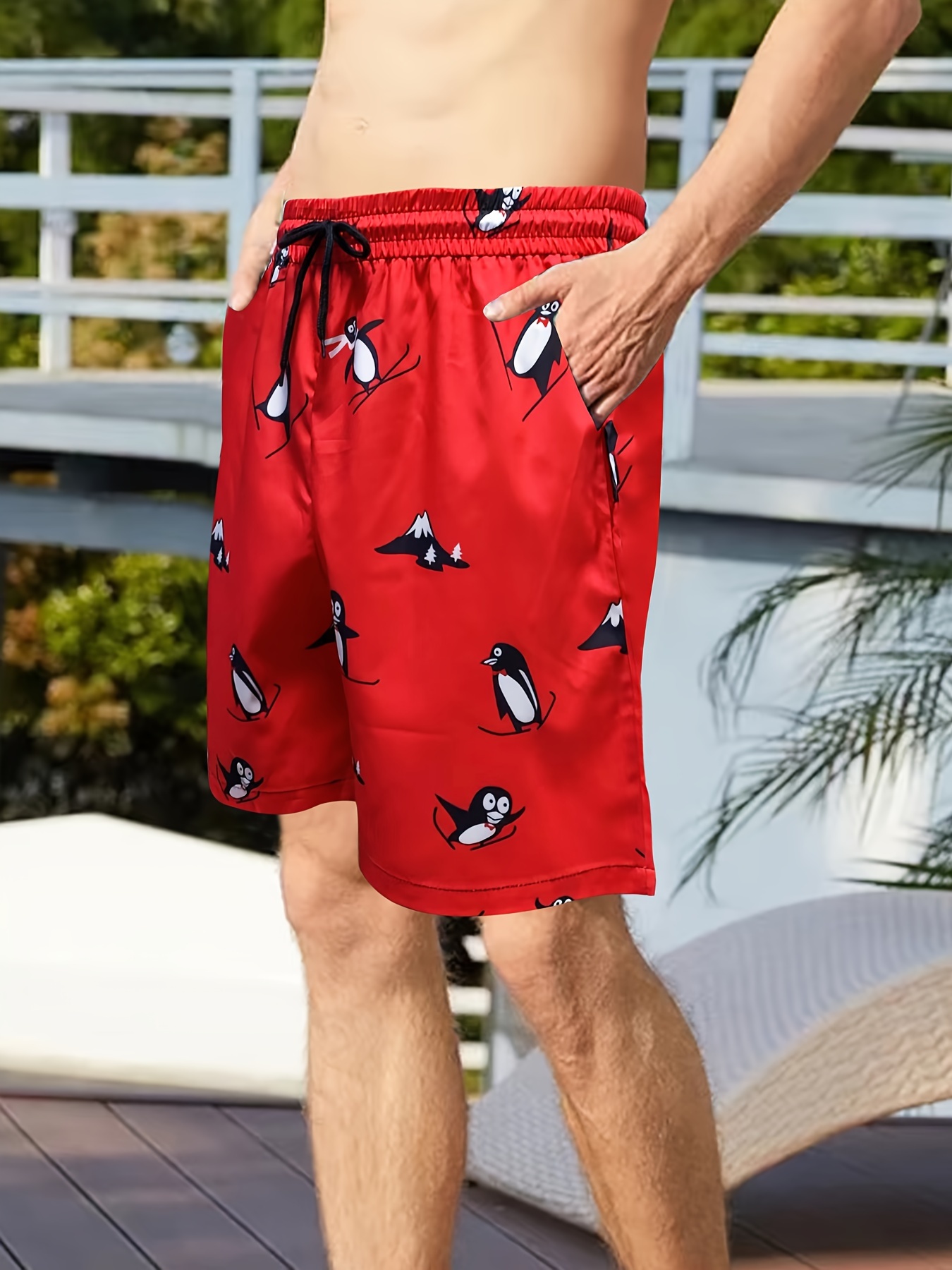 Men's Trendy Cartoon Penguin Pattern Print Active Shorts, Drawstring Beach Shorts For Summer Beach Resort, Hawaiian Shorts