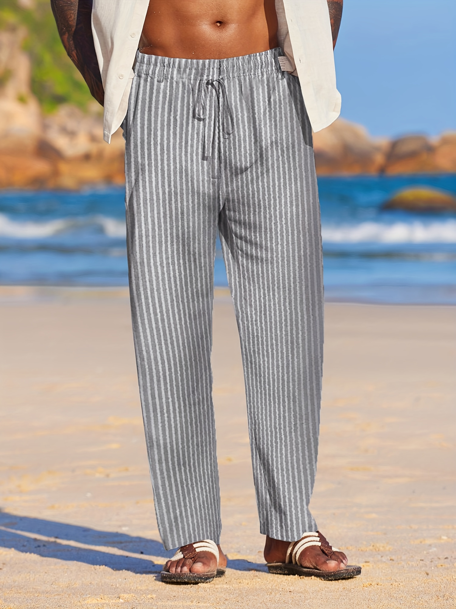 Men's Lightweight Striped Casual Pants with Elastic Waist and Pockets - Perfect for Casual Attire