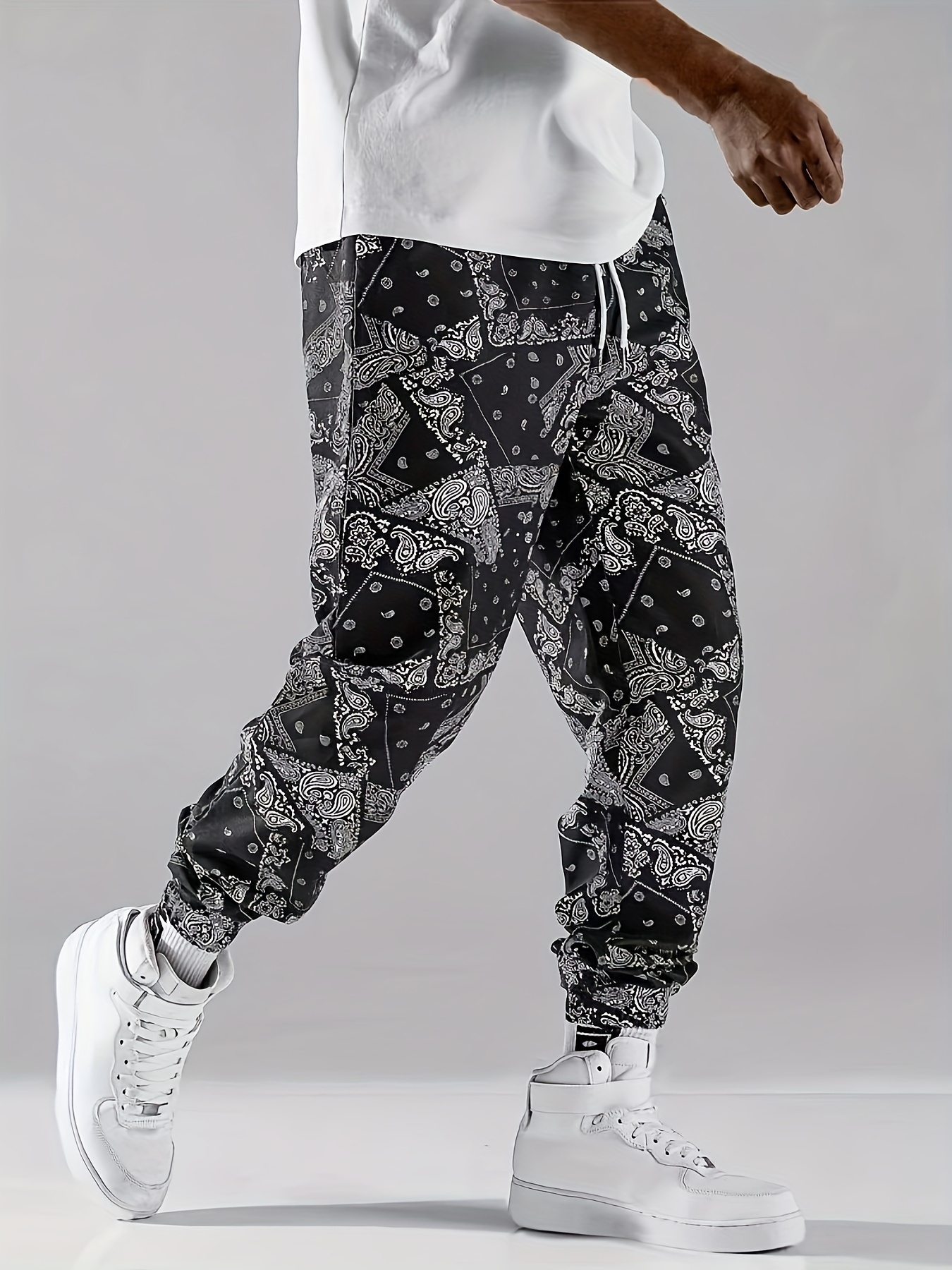 Stylish Paisley Print, Men's Casual Cuffed Pants, Breathable Lightweight Comfy Drawstring Pants