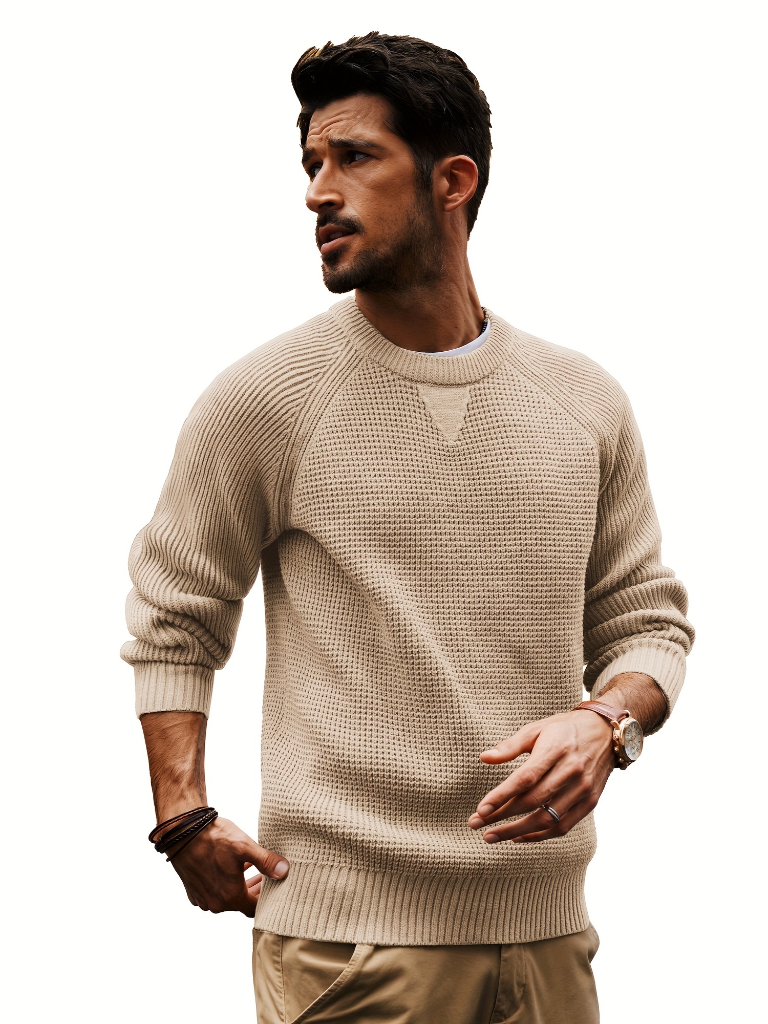 Men Waffle Textured Sweater Long Raglan Sleeve Crew Neck Ribbed Cuff Pullover