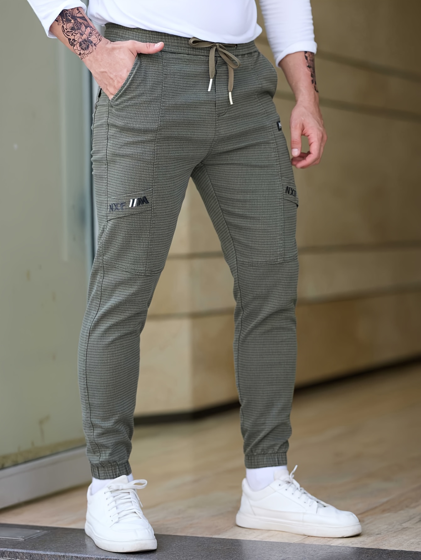 Men's Cotton Blend Label Decor Jogger Pants With Drawstrings, Casual Loose Fit Harem Trousers As Gift
